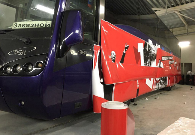 Можно сделать вывод, что при оклейке автобусов нами применяется как виниловая аппликация самоклеящейся пленкой, так и полноцветная печать на самоклеящейся пленке с последующей ламинацией и наклейкой на борта транспортного средства.