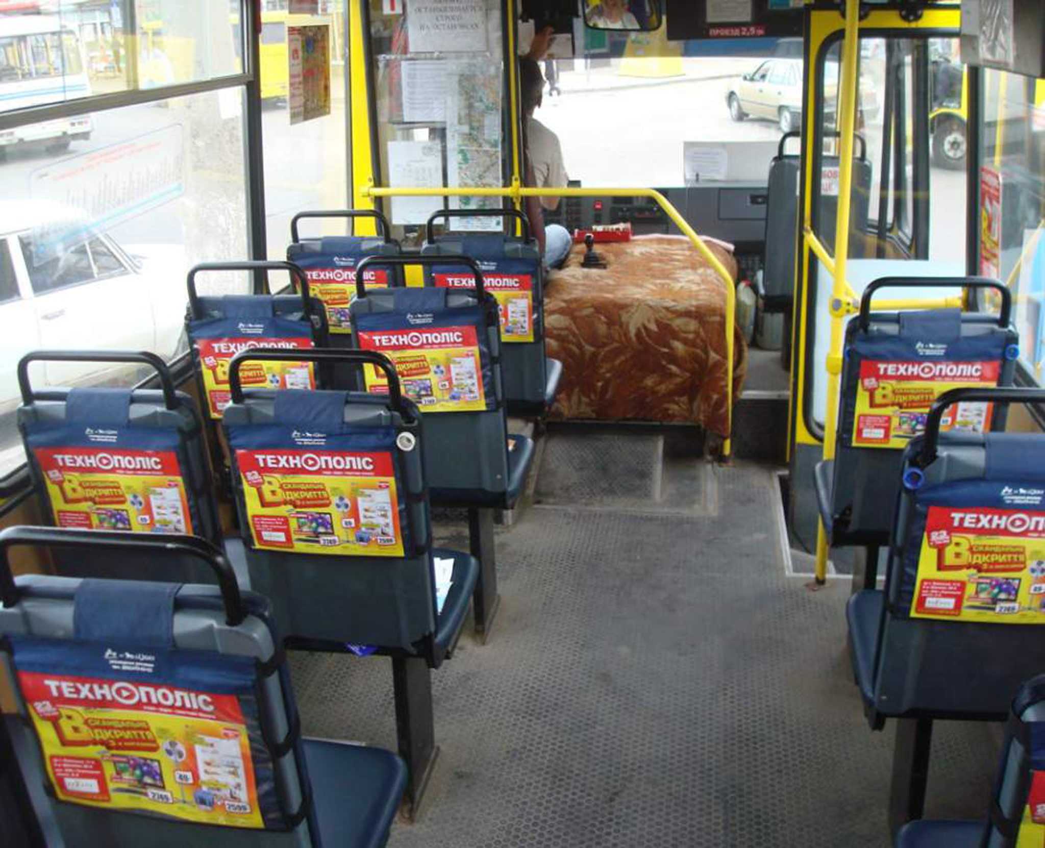 Реклама на подголовниках в междугороднем автобусе на фото выше