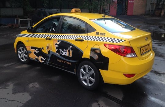 Можно сделать вывод, что при оклейке такси нами применяется как виниловая аппликация самоклеящейся пленкой, так и полноцветная печать на самоклеящейся пленке с последующей ламинацией и наклейкой на борта транспортного средства.