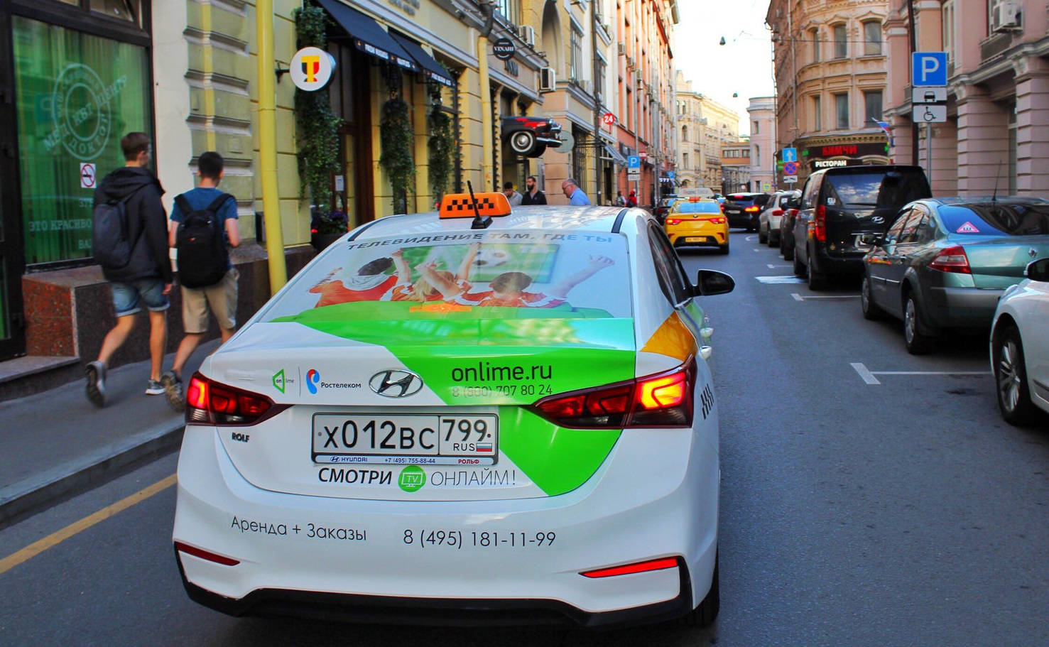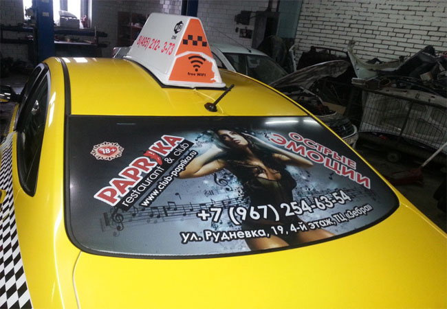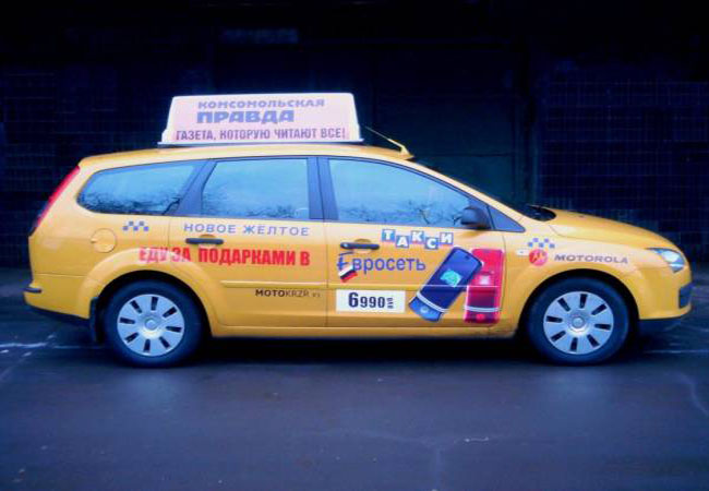 Многие рекламодатели с большим удовольствием размещают рекламу на/в такси. Что же представляет собой реклама на/в такси? Реклама на/в такси – это рекламное объявление, размещенное как внутри салона такси (листовки, постеры, мониторы), так и снаружи (оклейка дверей, бортов, заднего стекла, полностью кузова транспортного средства), сообщающее пассажирам, прохожим, а также водителям частных авто информацию о предлагаемых товарах, услугах и местах их приобретения.