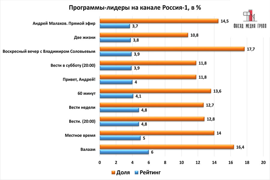 Популярность телеэфира на «Втором канале» приводит к ежегодному увеличению спроса на рекламное время. Для привлечения клиентов из разных регионов России, увеличения процента продаж, повышения имиджа компании и узнаваемости бренда – размещайте рекламу на «России 1». «Второй» – это проверенный и востребованный канал для размещения рекламы на губкинском ТВ. Для размещения рекламы на телевидении обращайтесь в рекламное агентство «Фасад Медиа Групп». Будем рады сотрудничеству.
