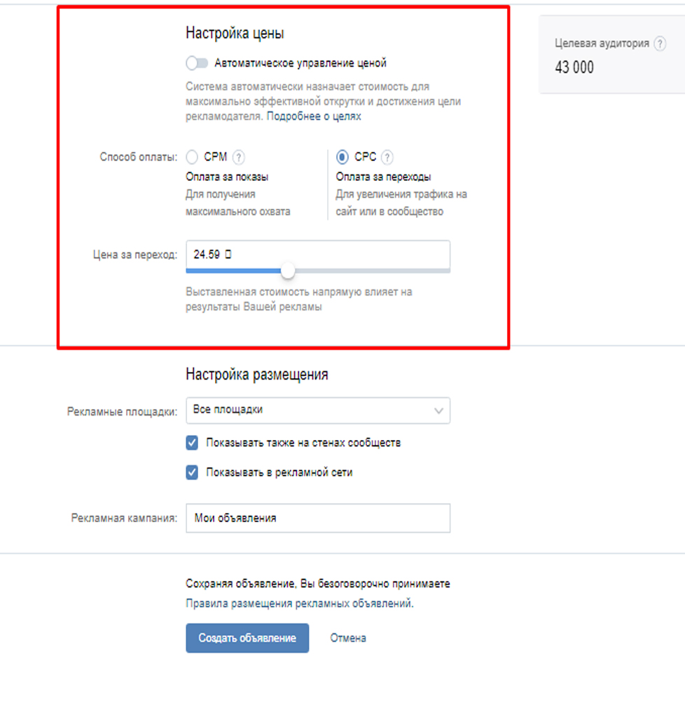 Автоматическое управление ценой – это умный алгоритм, который следит за ситуацией на рекламном аукционе и сам подбирает стоимость за 1 000 показов объявления, чтобы оно достигло выбранной цели. Например, чтобы вы получали заявки на мастер-класс или новых подписчиков в сообщество по желаемой цене.