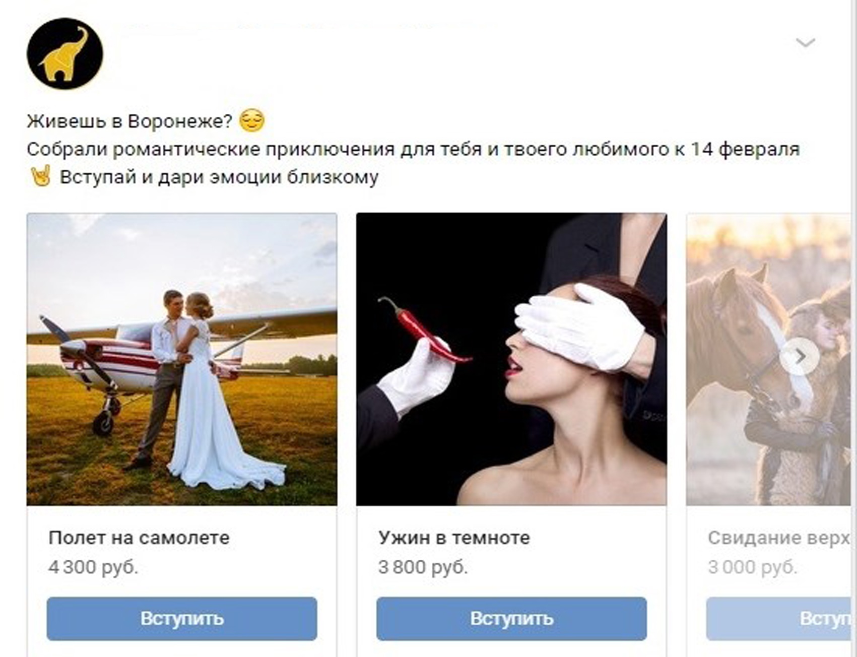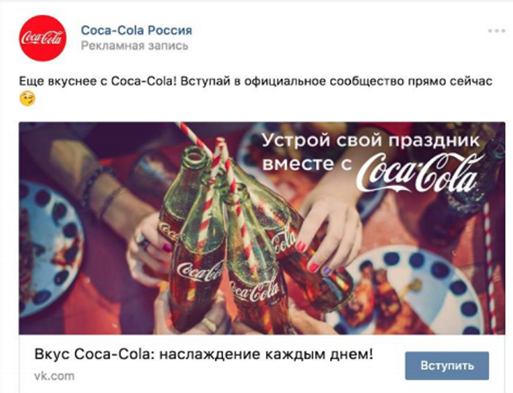 2) Запись с кнопкой ВКонтакте. Призыв к действию – вступить, купить, перейти и другие.