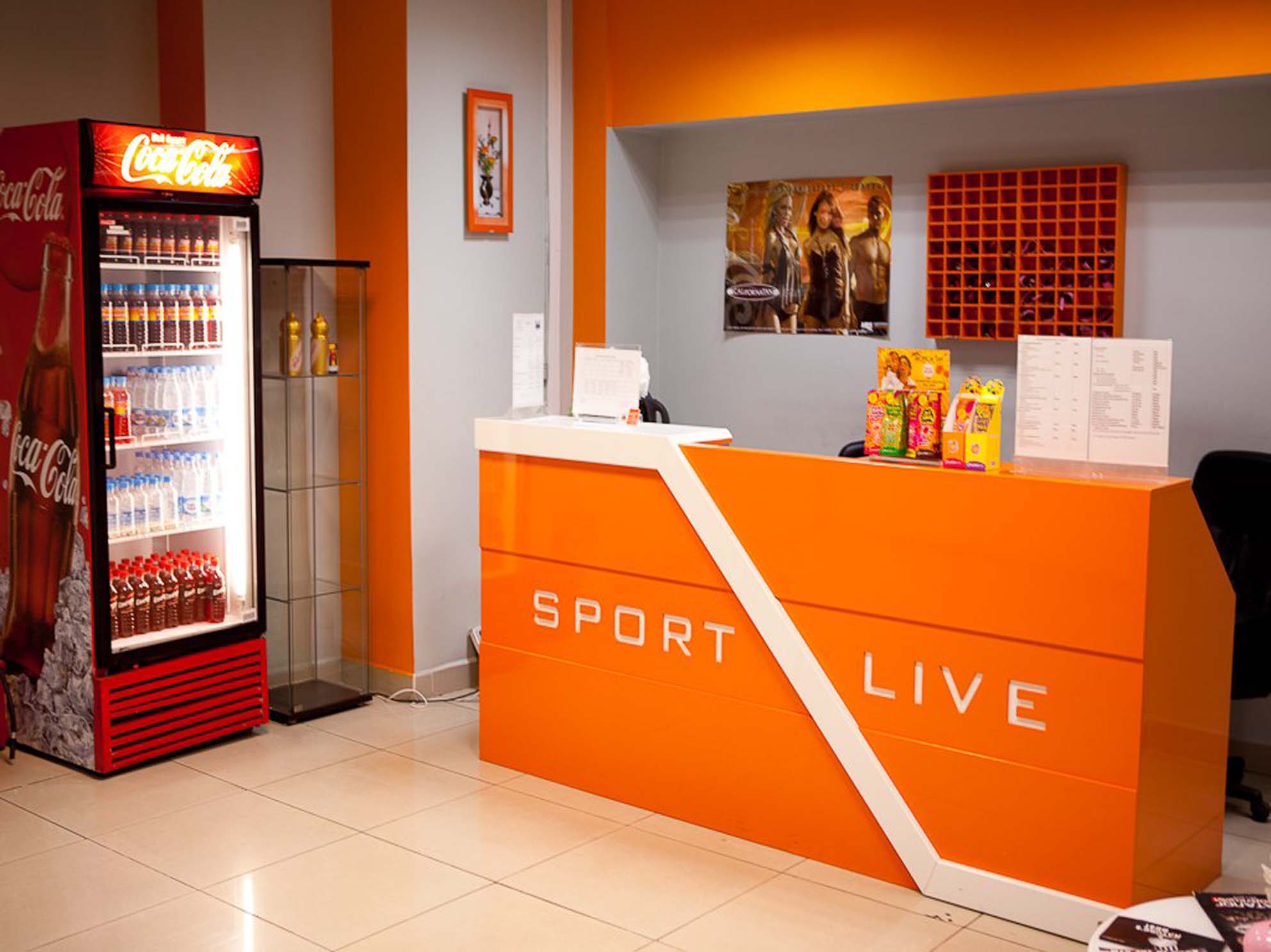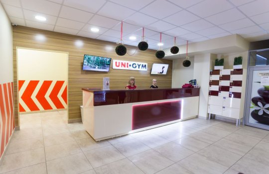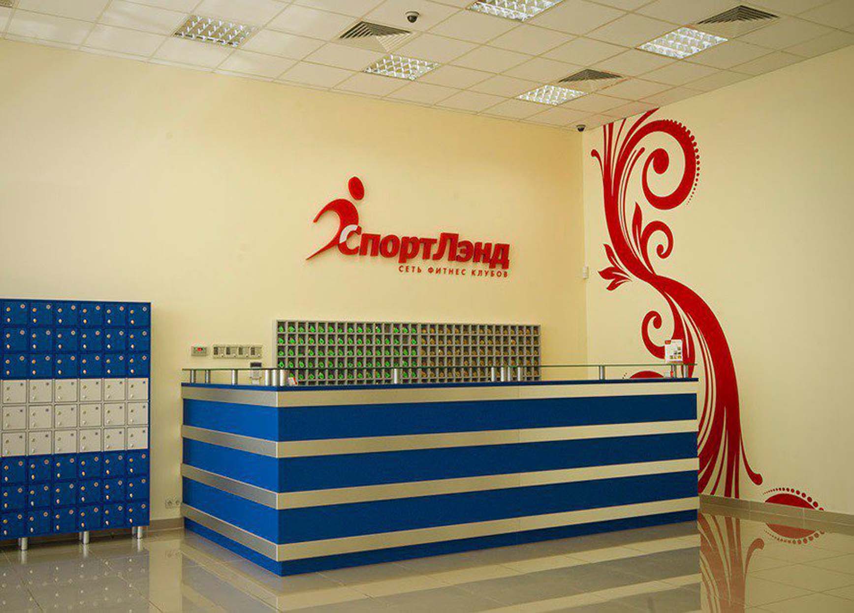 Пример брендирования входа и зоны ресепшн в фитнес-клубах: