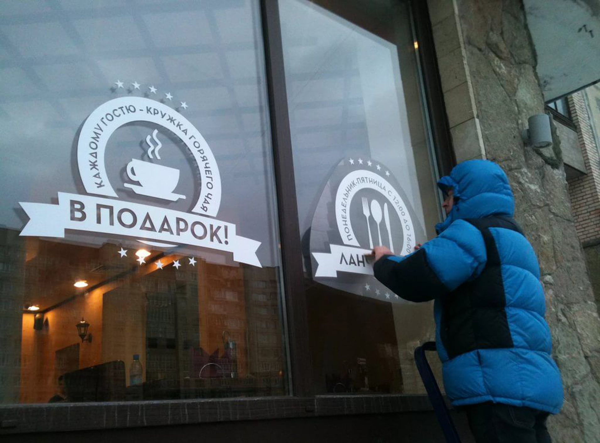 Стикеры являются одни из самых популярных форматов при размещении рекламы в кафе. Многие клиенты нашей компании выбирают дынный рекламный формат при планировании рекламной кампании в кафе. Одной из отличительных особенностей стикеров является их долговечность. Достигается это благодаря тому, что рекламный стикер печатается на специальной самоклеящейся пленке.